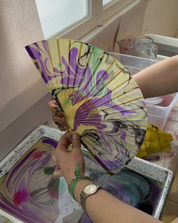 Una vez terminado lo teórico pasamos a lo más divertido, a la parte práctica, donde vas a realizar tus propios marmolados sobre diferentes materiales: telas, papeles y UN ABANICO!
